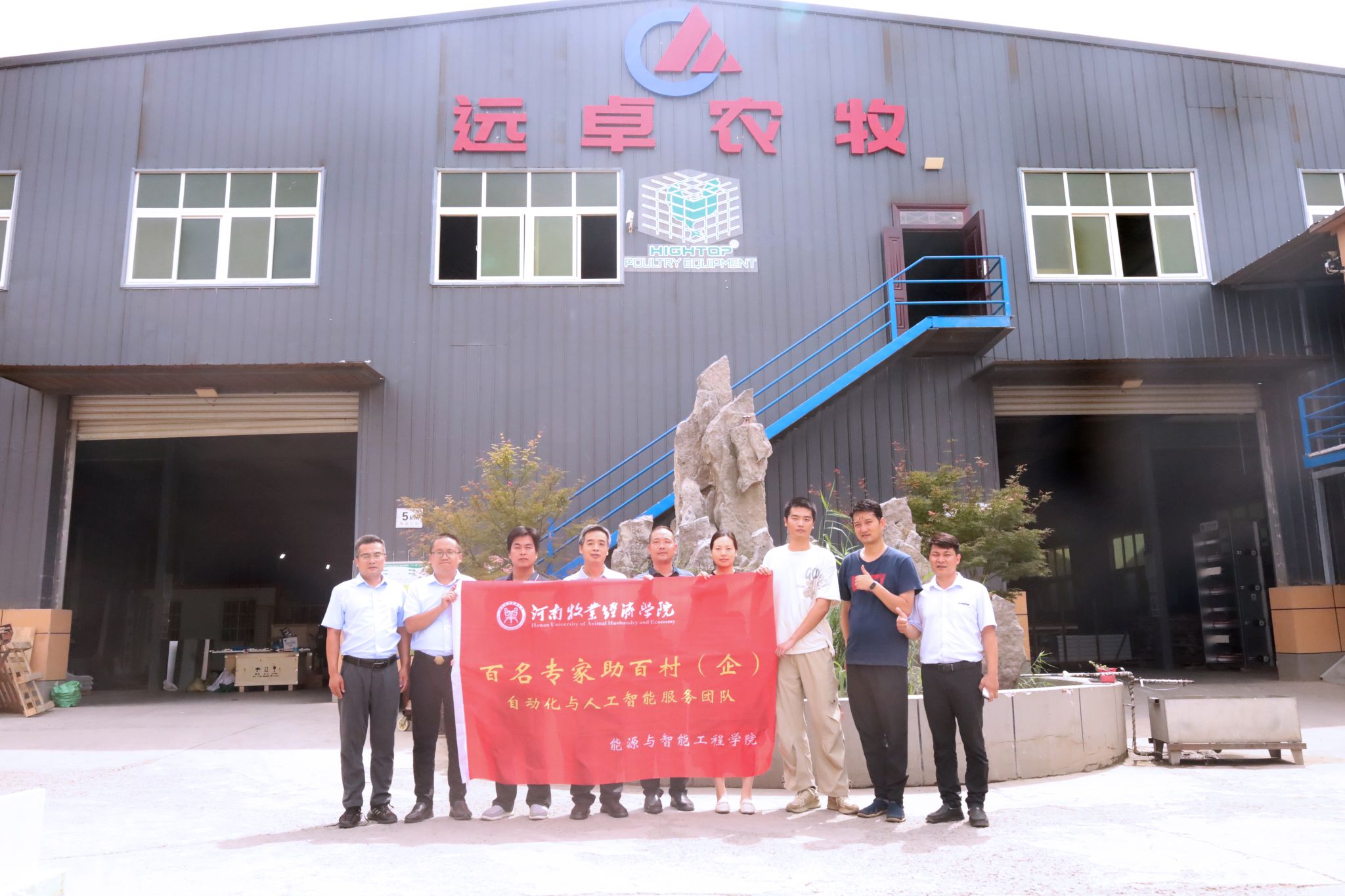 为深入贯彻“百名专家助百村(企)”工程(“双百”工程),充分发挥高校学科与专业优势,助力河南省智慧牧业技术创新与产业高质量发展,8月15日,能源与智能工程学院人工智能教研室教师杨志晓、张冰,以及信息工程学院教师王飞一行,赴郑州远卓农牧设备有限公司开展“双百”服务与技术合作洽谈。公司总经理王军,研发部马行坡、马峰涛、王星程,销售总监丁证伟,电商推广主管黑培鑫等热情接待并陪同参观交流。