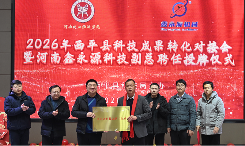 为进一步深化产教融合、校企合作,充分发挥科技人才服务企业作用,强化校地协同创新,2月6日至7日,能源与智能工程学院院长史岳鹏、副院长焦阳等一行,赴西平县参加县科技局主办的“2026年西平县科技成果转化对接会暨河南鑫永源科技副总聘任授牌仪式”。西平县科技局副局长朱贺年、河南鑫永源养殖设备有限公司董事长黄勇成等出席活动。